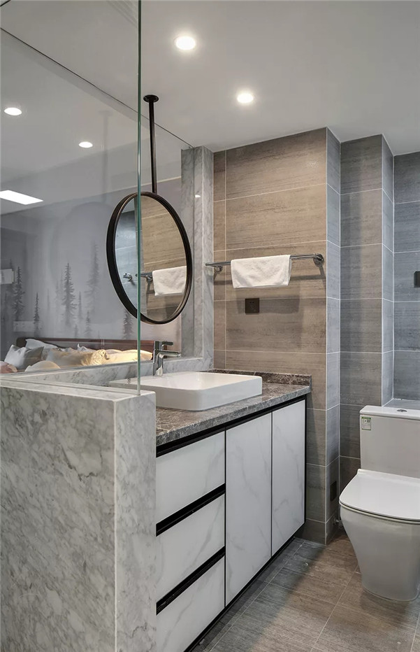 灰色+白色大理石纹样的洗手台和柜面,让整个主卫充分展现出现代时尚格调。