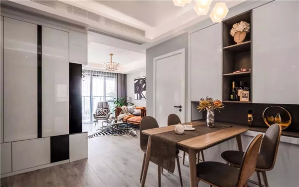 开门见餐厅,餐边柜以不过时的黑白格调搭配原木系餐桌椅,素雅清新。