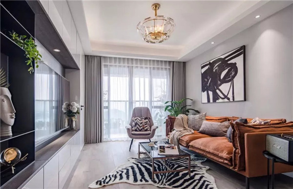 高级灰搭配橘色绒布沙发,满满的休闲感,两边角落以金属圆球落地灯+网红天堂鸟点缀。