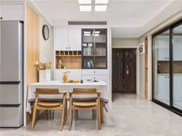 餐厅没有考虑定制餐边柜,失去了很多收纳以及实用的功能,有些家庭喜欢收集红酒,餐边柜可以设计出酒槽增强储物空间提高收纳。