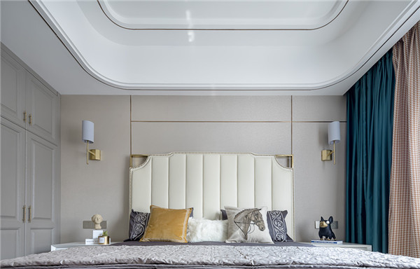 卧室以灰白色为基调,配以金属质感的床,床头柜,灯饰,标志性金属线背景墙,黄色抱枕,湖蓝色窗帘作为点缀,营造出卧室一种舒适温暖的的感觉,让一身的疲惫在此褪去。