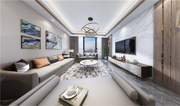 整个客厅以浅灰色和白色为基地,配以原木色护墙板,金属色线条,个性化灯具,低调而奢华。