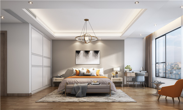 浅灰色的背景墙,配上黑白艺术挂画,简单的吊顶,让整个空间不繁杂而富有有立体感,灰色的地毯与墙面相呼应,整个空间浑然一体,给人舒适的感觉。