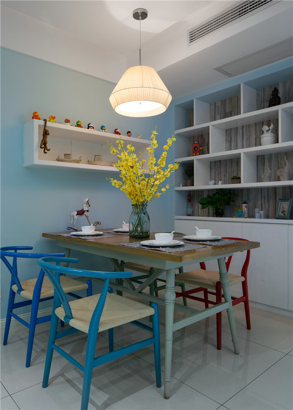 把餐厅设置在角落一方,一张小小原木方桌和几张色彩不一的餐椅,色彩对比鲜亮。