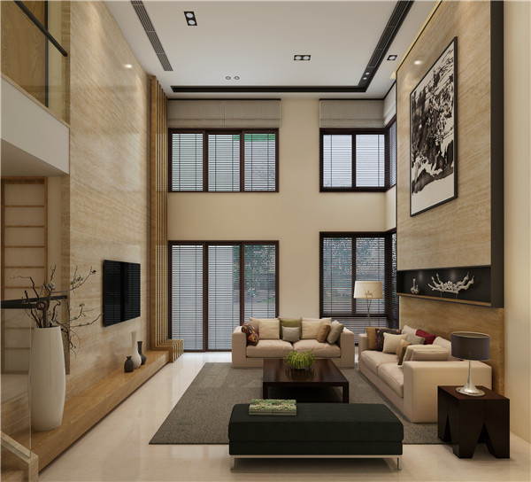 挑高的客厅以原木的色调为基调彰显雅致,黑色茶几桌与浅色沙发,一深一浅的色泽差异使得空间更具层次感。加上黑色水墨画与无主灯的设计,品味油然而生。