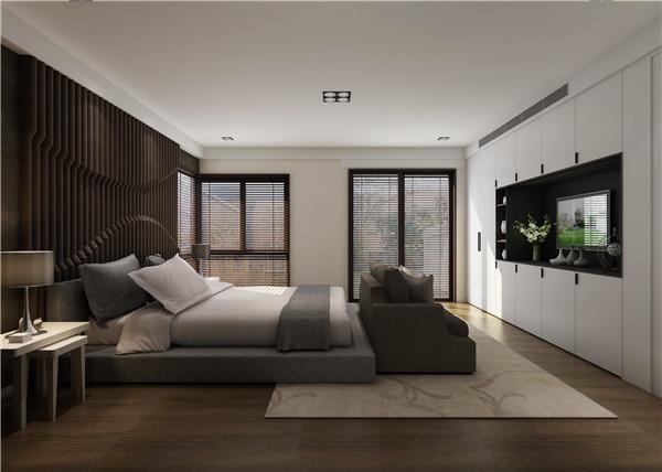 卧室以深棕色加奶灰色为基调,温馨感十足。软包的床更让人有种情不自禁的亲和感,两闪落地百叶窗的设计,让日光的照射下,让穿透性完全延伸到极 致,简约优雅,别致舒心。