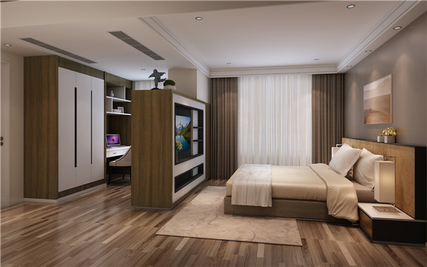 用电视隔断墙将休息区域与办公区域区分,赋予了空间的功能使用。结合卧室户型结构运用了大量的原木元素,木色的质感温馨舒适,使得空间不为拘谨,更为放松。