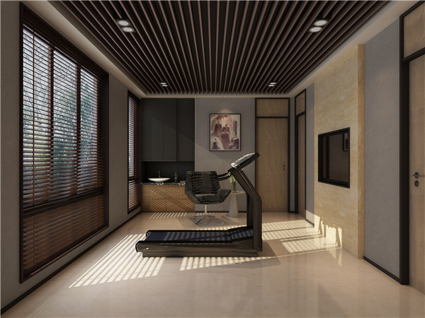 运动休闲的区域没有过多的装饰装修,百叶窗的设计,让健身房的空气更加流通,有利于做有氧运动,一台跑步机占健身房1/3空间,在运动的同时,也便于身体做拉伸。