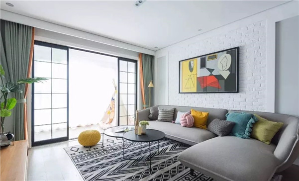 客厅,采用大张地毯搭配灰色,沙发规划出客厅场域,白色文化砖铺贴成沙发背景点缀艺术挂画。