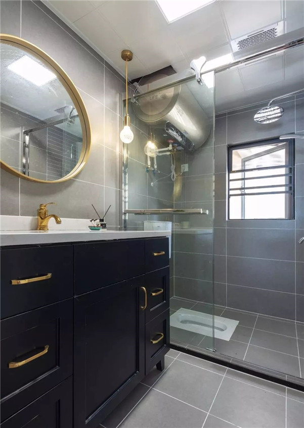 卫生间,整体通铺灰色瓷砖加白色美缝,金色元素相互穿插使用,玻璃淋浴房尽量做到干湿分区。