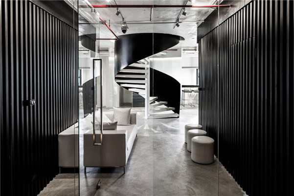 整体给人神秘与简约,黑色的墙面搭配原始的灰色水泥顶面给人精致的效果。金属管道纵横交错使得空间回归原始的局面,旋转楼梯的设计为空间增加造型效果。
