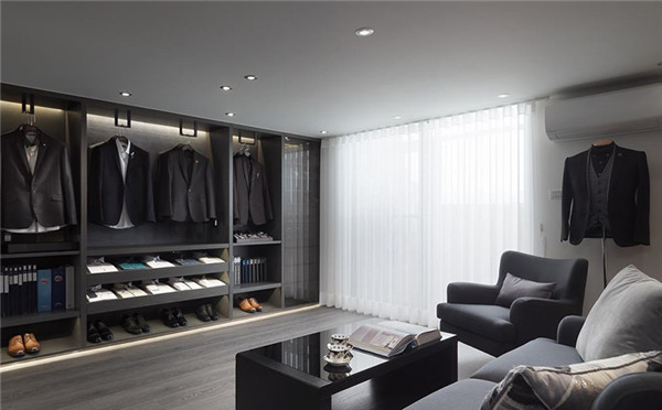 从室内色彩出发,男士西装店面装修设计色彩不宜过多,西装给人十分正式,相应的色彩注意选择深色系。西装店推荐选用黑、白、灰这样的主色调,不会抢走西装的风采,还能保证服装的沉稳。