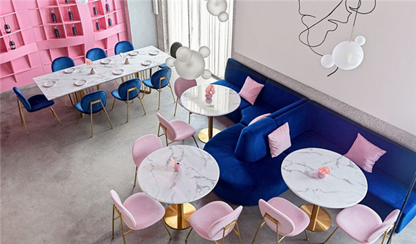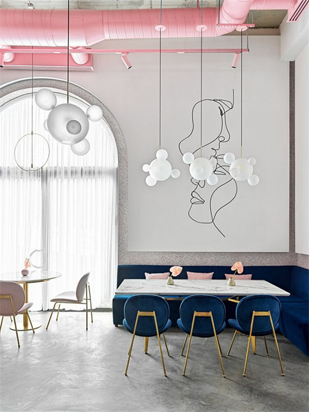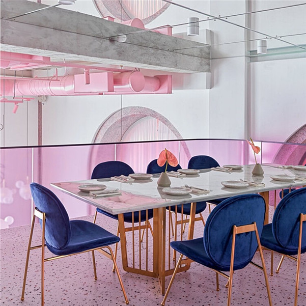在餐厅装修中选配具圆润身形与高饱和色调的家具,以及装饰一幅美国艺术家David Cantu的极简主义艺术品,使空间在坚实拙朴中透散着优雅迷人质感。