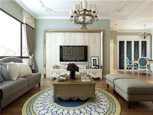 2、灯光对于简欧风电视墙的装修也很重要,建议选择光线和外型都偏向柔和的灯具,千万不能使用太过华丽的水晶灯或是闪亮的钢制灯具。至于装饰画,可以选择比较厚重的画框,但配色要以淡色为主。