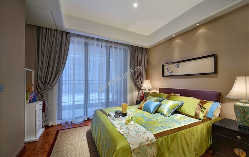新中式风格225平别墅卧室背景墙装修设计效果图