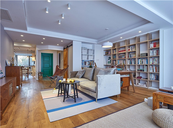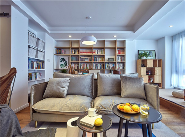 客厅和书房共同链接在一块整体空间,中间没有做任何隔断,前半部分是客厅,后半部分用做书房或者办公区域,墙上书柜,重复利用空间也能放置大量书籍。