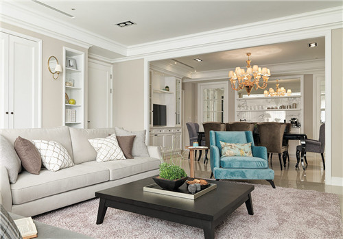 欧式风格在不同地域中受到文化洗礼,发展成分支各异的欧式风格,其中最常见的风格有北欧和简欧,深受装修用户的青睐。通过室内线条感的变动,华丽的色彩体验,在形式上突出浪漫元素。因而在材料选择上,多采用天然石材、色彩丰富的纺织品、精细做工的地毯已经油画等装饰品。让整个客厅空间看起来非常大气浪漫,生动形象,同时明快的线条感,让整个空间典雅自然,深得高端人士的欢迎。