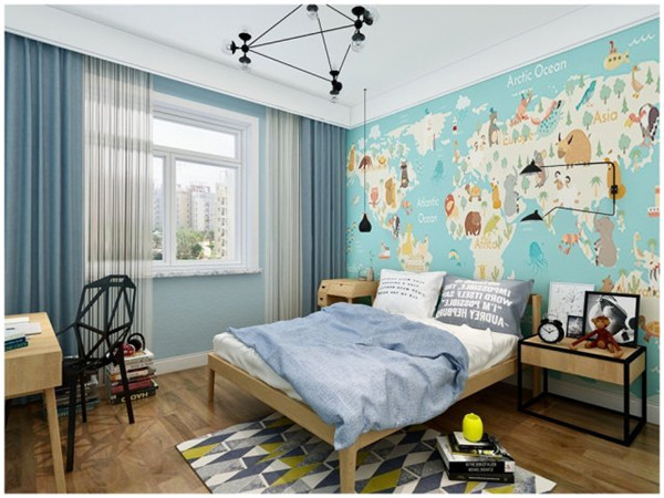 次卧室是个男孩房,整体颜色搭配蓝色偏多,窗户边上有一个写字桌,方便平时学习。