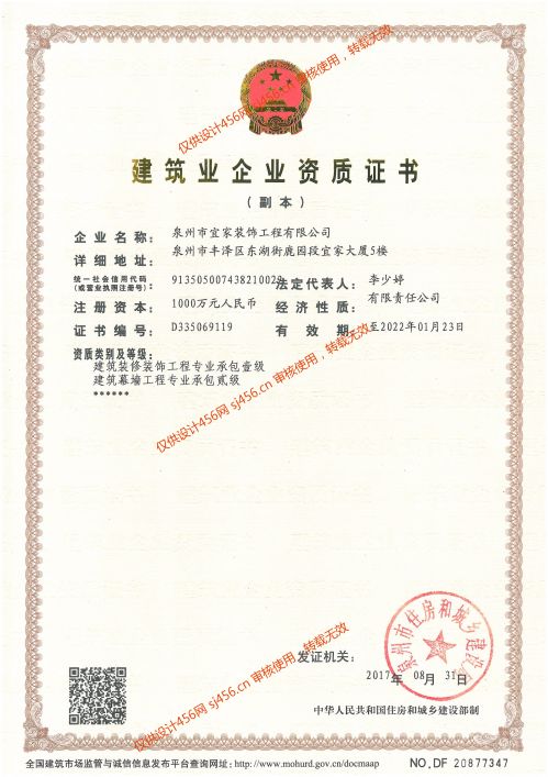 泉州市宜家装饰工程有限公司创立于2000年3月,拥有国家住建部颁发“建筑装修装饰工程专业承包壹级”、“建筑装饰工程设计专项甲级” 、“建筑幕墙工程专业承包贰级”“古建筑工程专业承包叁级”资质,获得国家住建部颁发的“建筑施工安全生产”及省市相关政府颁发的众多荣誉。服务行业涉及地产、酒店、度假村、银行、展馆、幼儿园、医院、政府办公楼及各企业办公楼;主要客户有:融创地产、绿城地产、南益地产、东海地产、金爵地产、群盛地产、中建(泉州)、东呈酒店集团、泉州第一医院、兴业银行、农商银行及政府各机构部门。成立19年来,坚持“客户至上、真诚、正能量”的价值观,得到众多客户的支持与厚爱。 公司连续十年被福建省建筑业协会评为“省住宅装修业10强企业”,期间成立了晋江分公司、丰泽分公司、厦门分公司;创立高端设计品牌“大师装饰”、家居生活馆品牌“云巢汇”,并在2017年成立大师装饰晋江分公司;同时集团设立运营中心,树立标准化管理体系及引进中国顶级工程管理体系,结合19年的管理经验,编制宜家装饰独有的“装饰公司运营手册”和“蓝钻标准工艺手册”,打造家居装饰行业一站式服务的产业链。