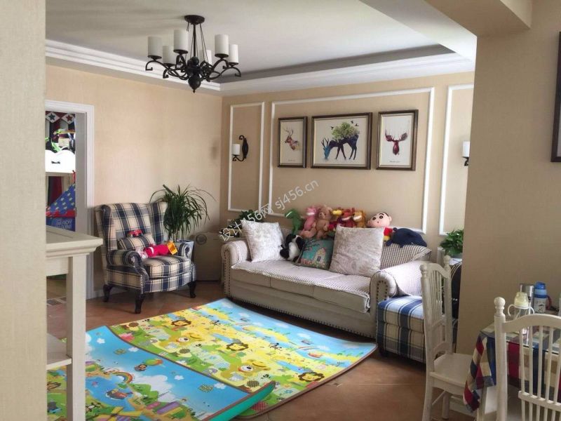 120平米现代美式风格三居客厅墙面挂画装修实景图