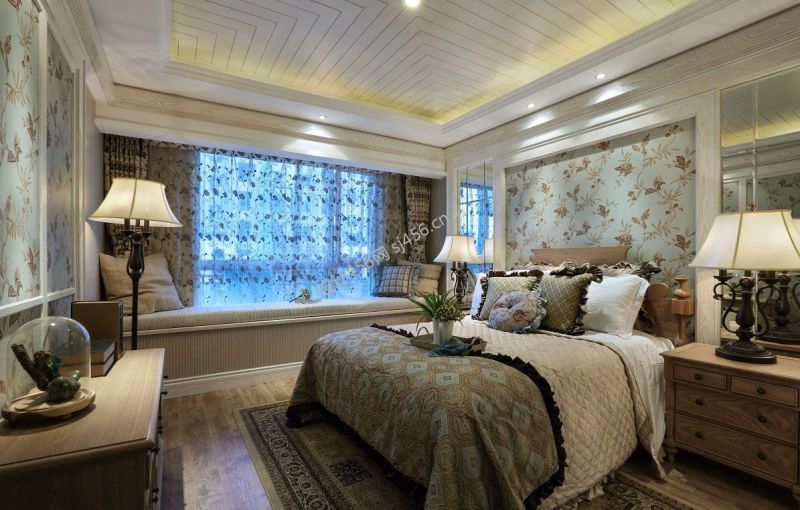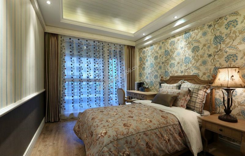 田园风格117平米三室两厅卧室床头装修效果图