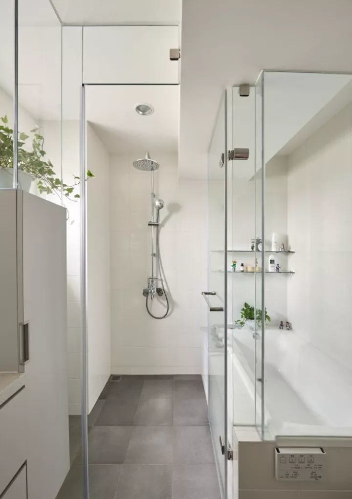 ▲ 白色的墙壁和灰色的地砖搭配,简单低调。玻璃隔断的设计,有效防止了湿气散发。