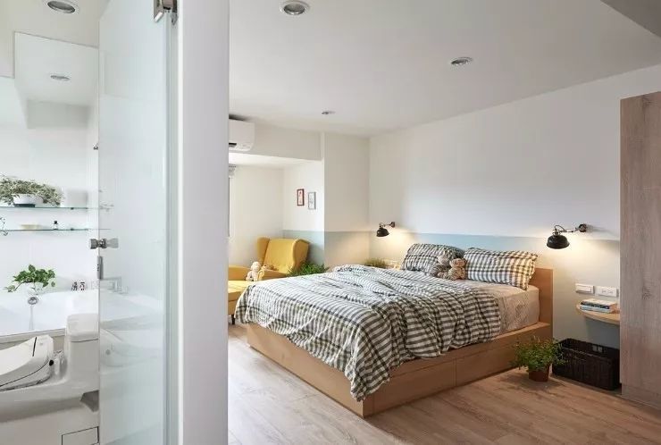 ▲ 卧室保持简单的风格,只有一张床和一张舒适的家具椅子。