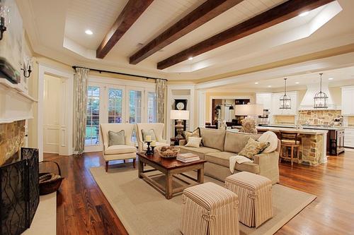 3、通过屋顶来划分。你可以在客厅的区域里装铝扣板,而在餐厅区域装石膏板吊顶。两者可以一样平,也可以让厨房的铝吊顶略低于餐厅吊顶部分。同样,这样的划分时,家具也相应作分区摆放,你那长方形的房间,比较适合这样的分区设计。