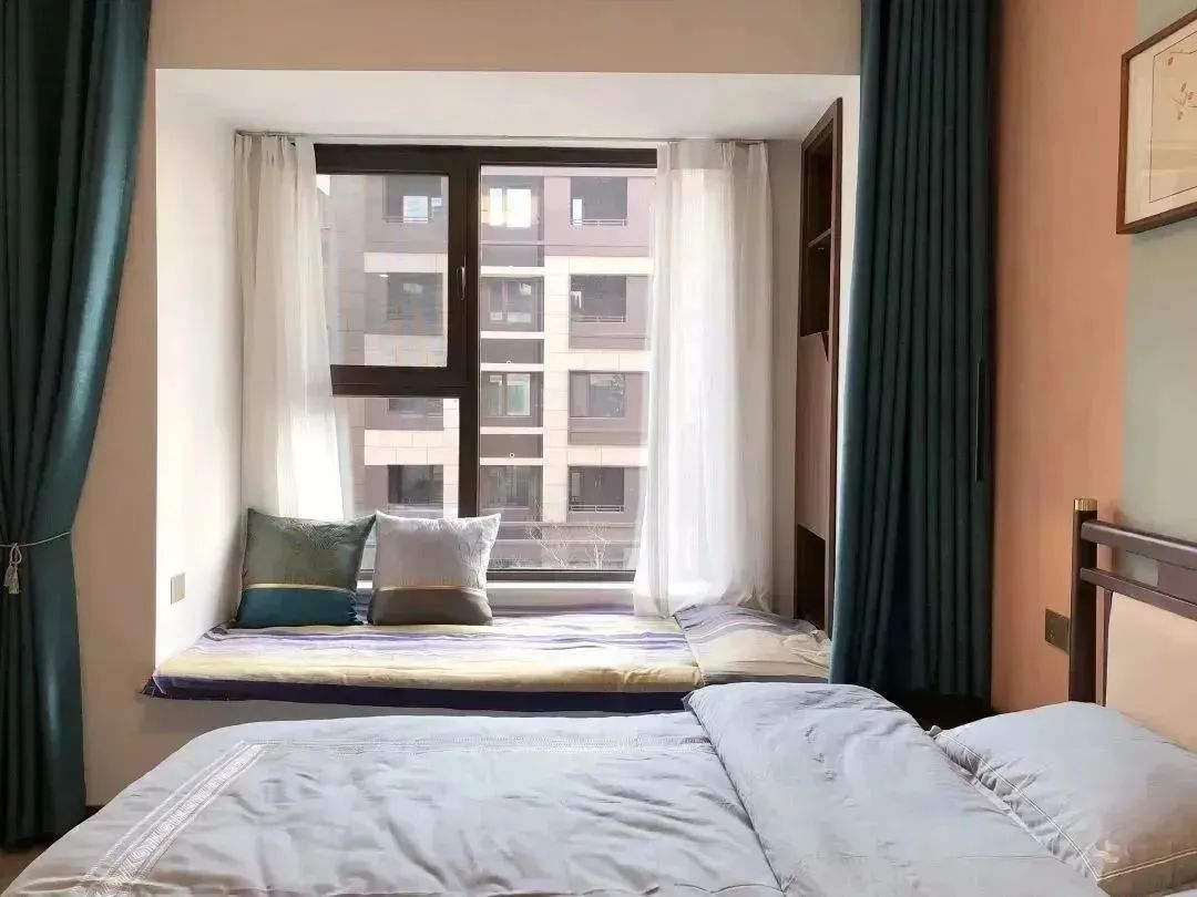 现在大部分的户型都会有飘窗,很多时候都会觉得飘窗鸡肋,但对小户型来说,飘窗就很重要了,比如可以把飘窗当做一个凳子,或是将梳妆台挨着飘窗,加宽台面的面积,就可以把飘窗当做床头柜使用。