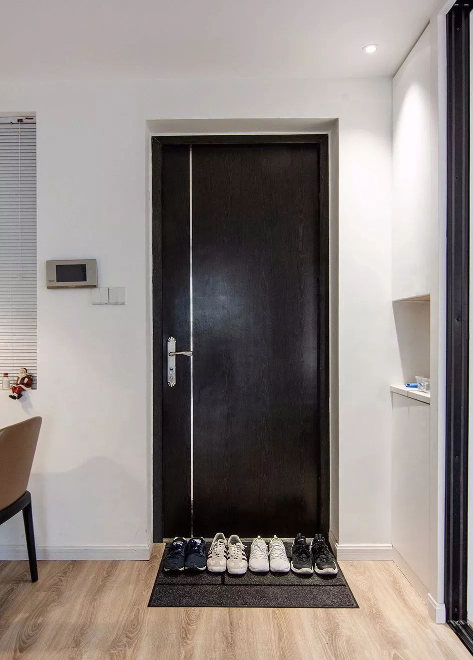 入户的玄关走廊处做了嵌入式的鞋柜,鞋柜的中间留空方便放钥匙、包包等小件的物品。黑色的木门搭配白色的墙面,很有现代风的感觉。