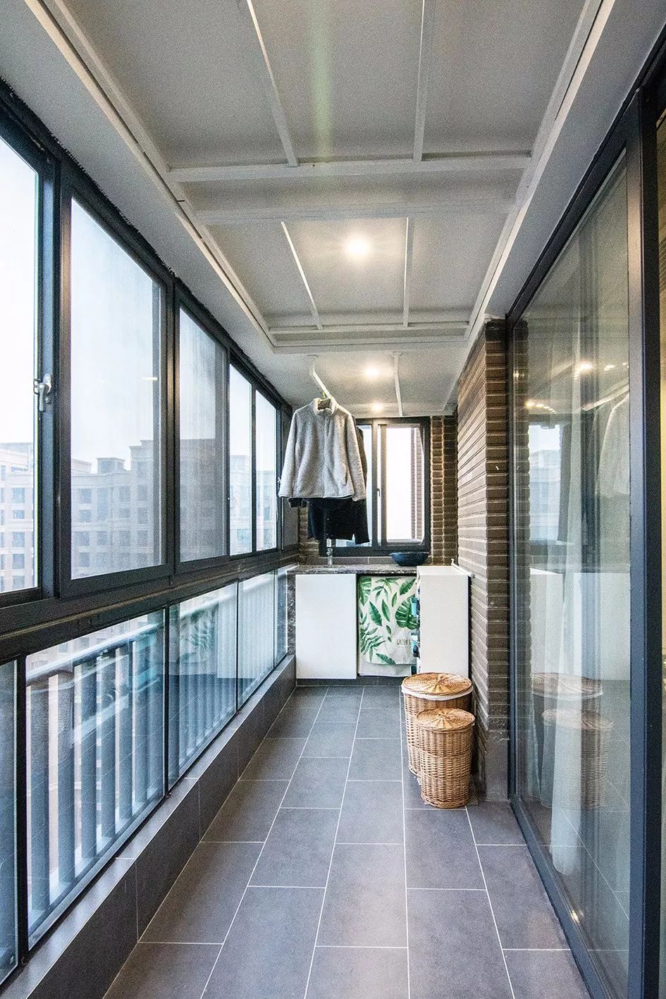 客厅的外面是一个比较狭长的生活阳台,在阳台一侧做上洗衣机和洗手台,顶部用晾衣杆做了创意的造型,也起到吊顶的装饰效果。