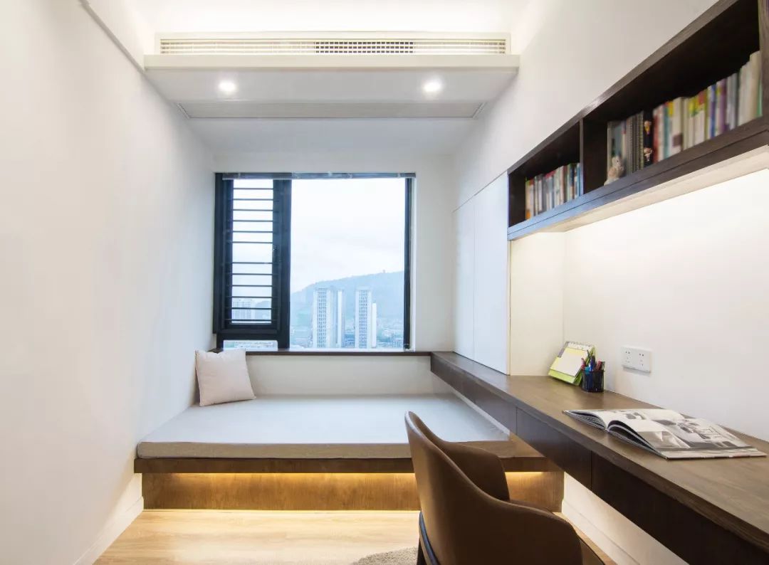 还有一间房被设计师改成了榻榻米地台和书桌、书架的设计,在地台的底部加上藏光,让这个空间看起来更为时尚和大气。