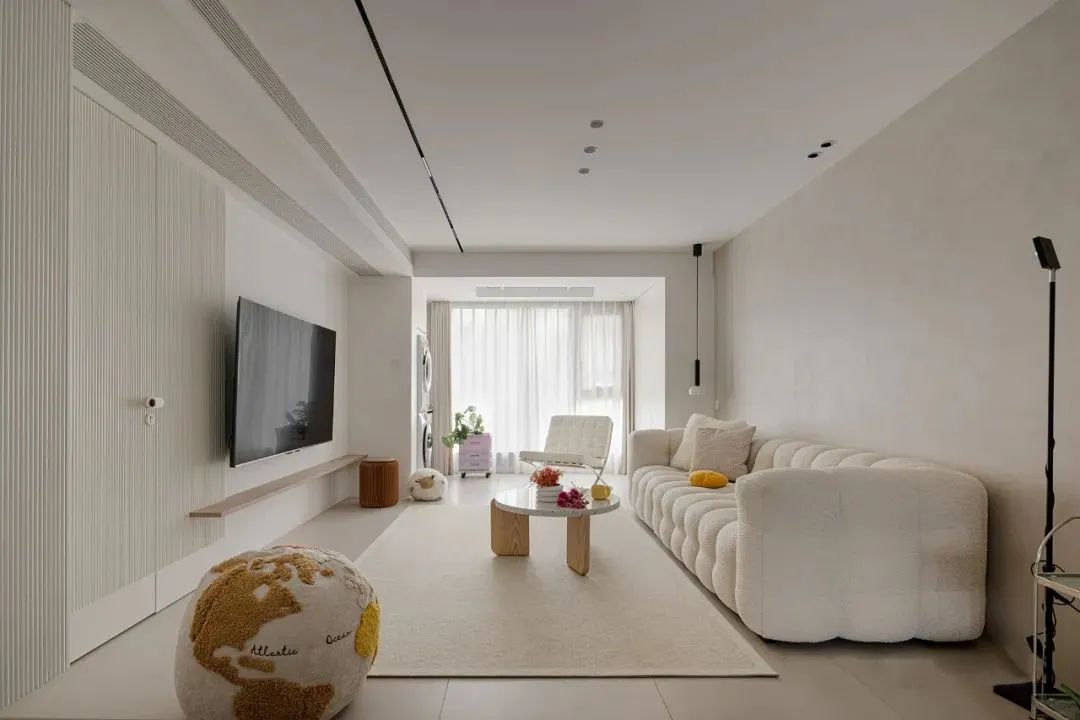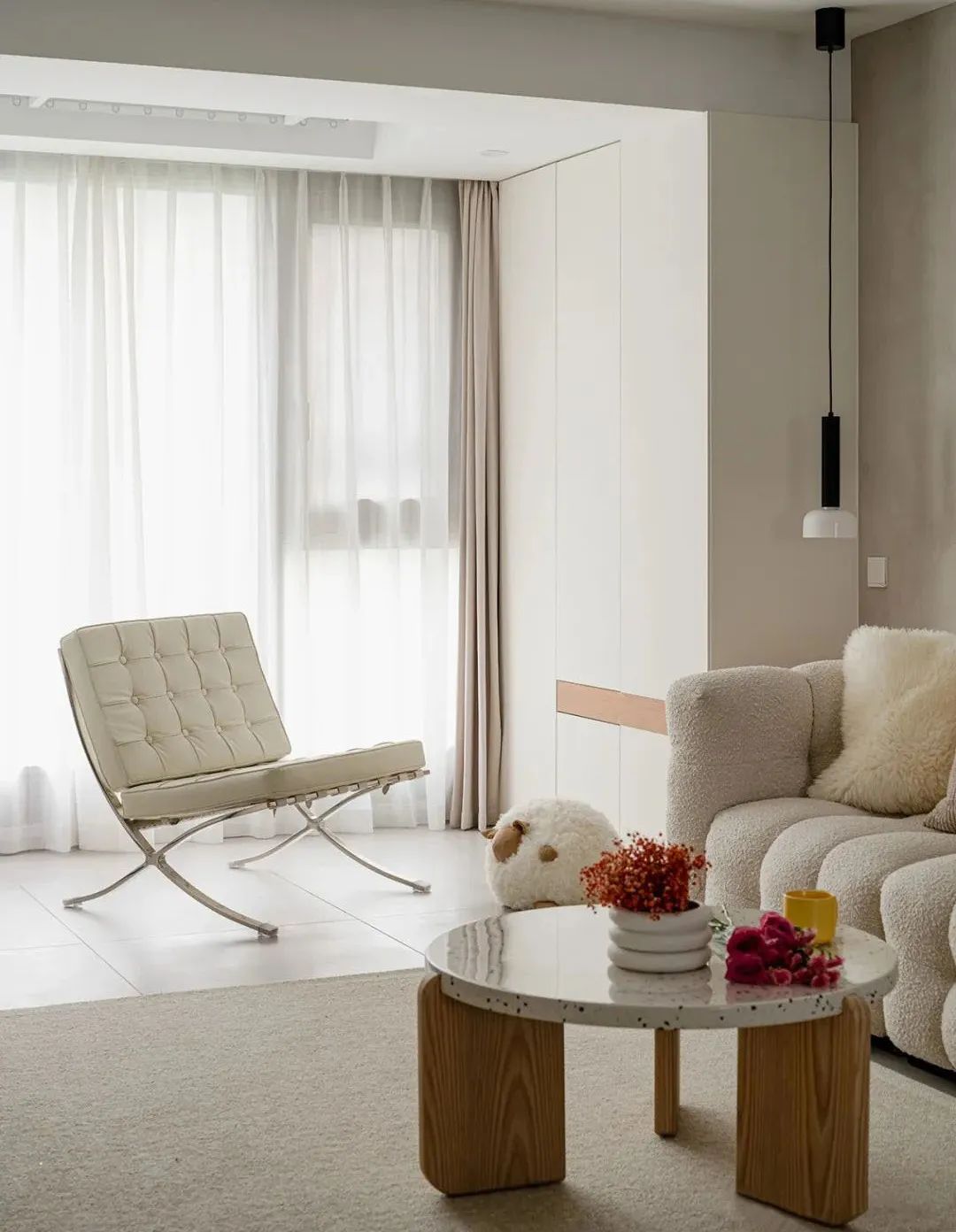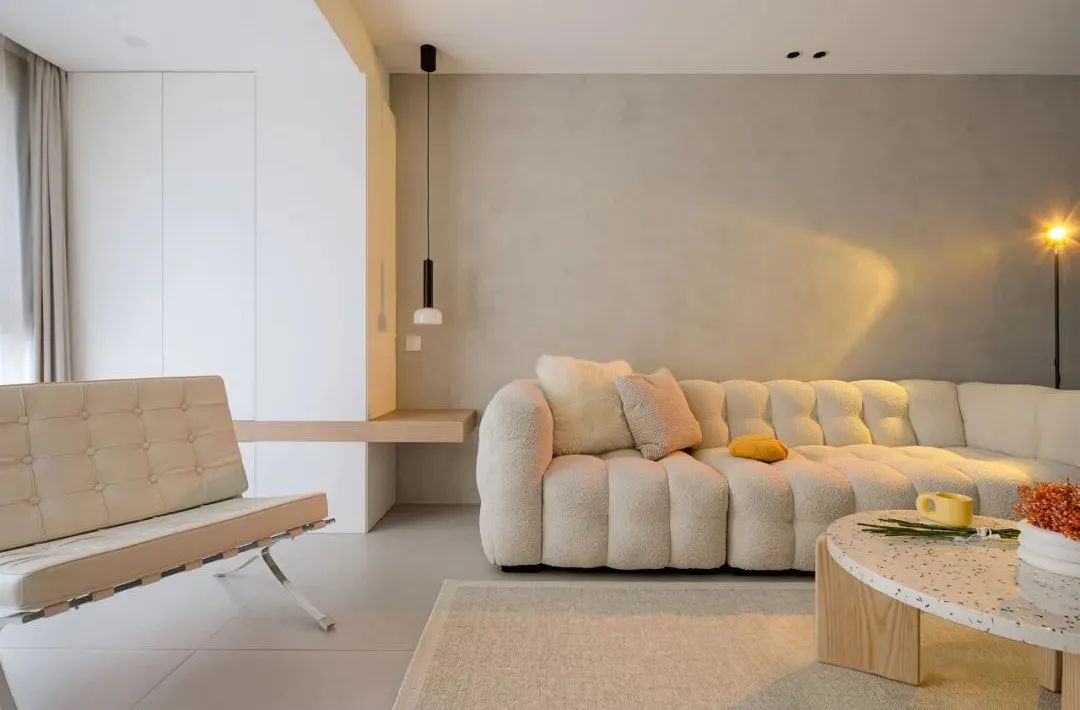 布置羊羔绒主沙发,松软的体块组合舒适慵懒,阳台自然采光+温暖的灯光点缀,配合上奶油色的墙面,瞬间柔化空间格调。