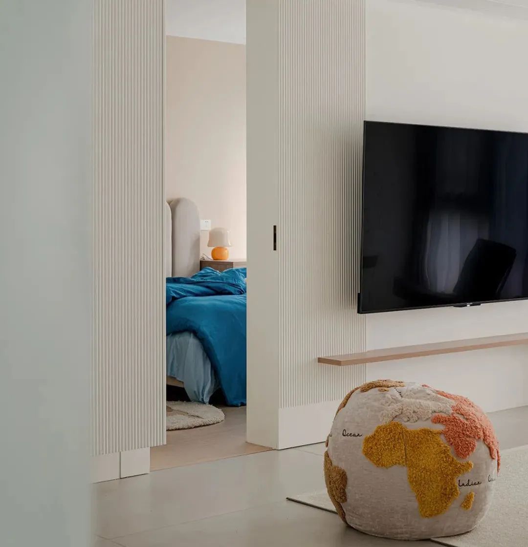 电视背景墙,简洁留白结合波浪板,简约而有设计感,下方悬空增设隔板当电视柜,与儿童房以波浪造型门板自然划分空间。