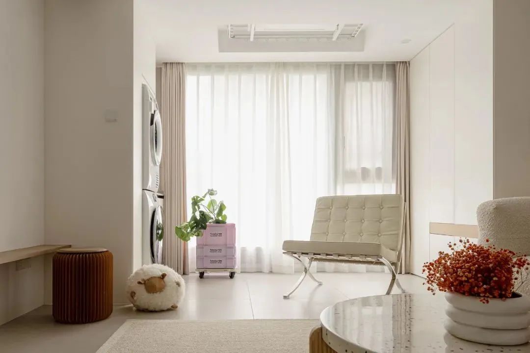 打通阳台,柔和的自然光线穿梭于室内间,两端定制通顶高柜,一侧镶嵌进洗衣烘干机,强调实用性的搭配设计,完善不同功能区的格局。