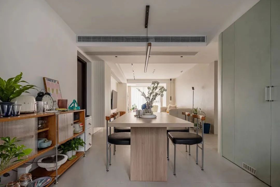 餐厅,餐桌居中摆放,两侧柜体补充收纳储物,原木餐边柜充满温馨自然,以绿植与餐具穿插摆放,细节处的长虹玻璃增加通透性。