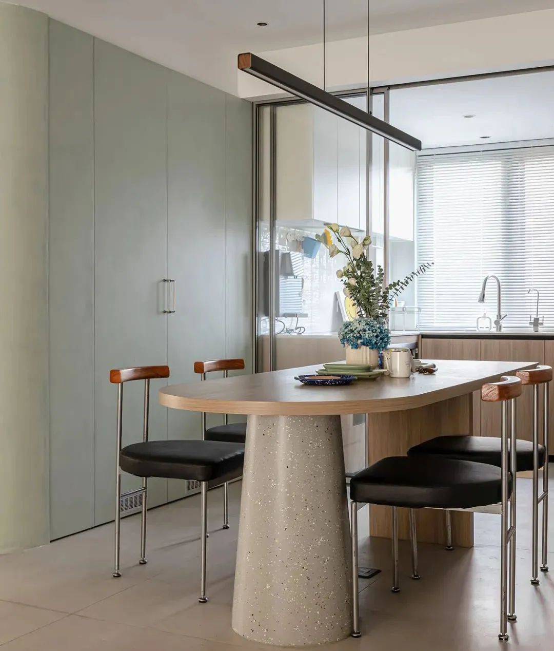 原木餐桌结合艺术漆制作的水磨石纹理桌腿,极简吊灯与现代餐椅相呼应,背景定制青色餐边储物柜,内嵌冰箱满足生活使用。