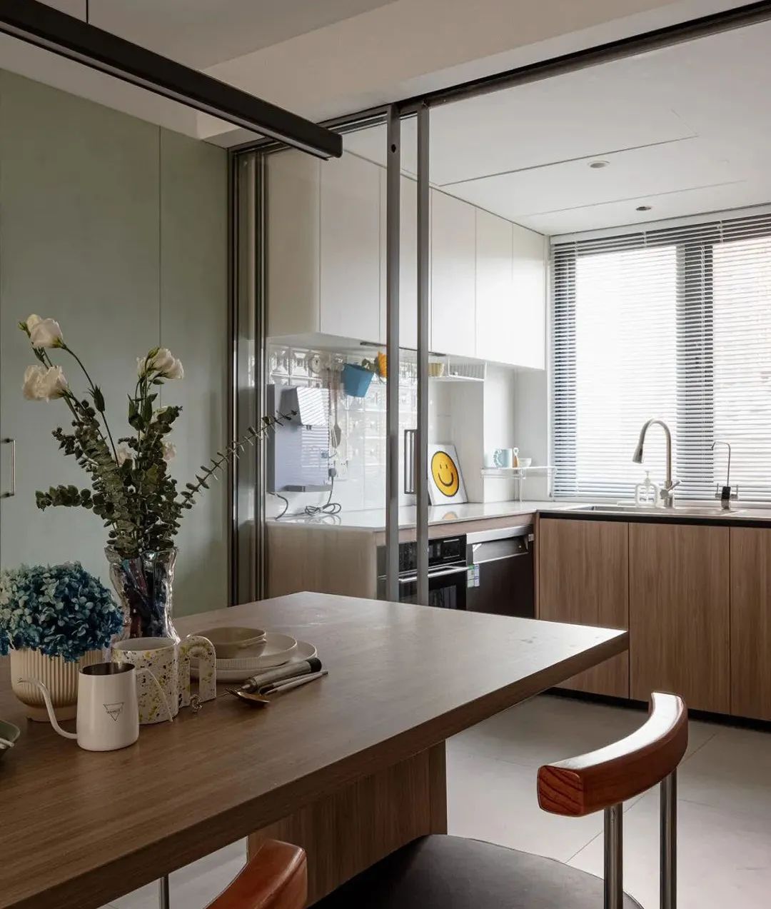 以玻璃移门做餐厨隔断,定制胡桃木橱柜搭配奶白色吊柜,百叶窗设计增强厨房明亮度,与客厅形成南北通透的视野格局。