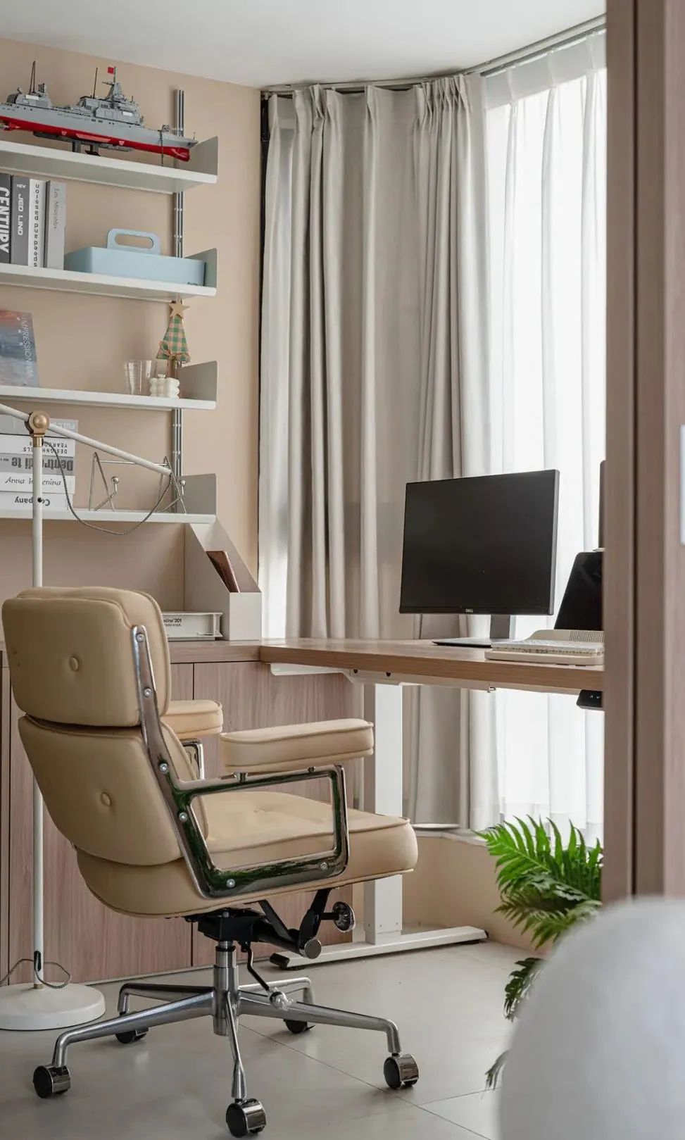 通往书房入口以垭口做弧度处理,整体以肉粉色搭配杏子色调铺陈,靠墙定制储物柜,靠窗延伸出写字台,增设开放书架满足需求。