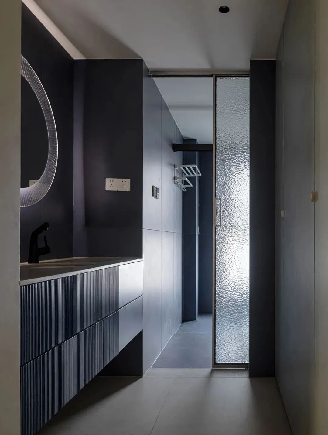 客卫,干湿两分离设计,整体通铺深蓝色墙砖,搭配同色系浴室柜,湿区定制大量收纳系统,极窄压花玻璃移门保证光线的通透感。