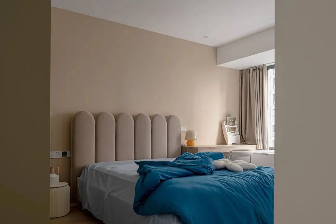 儿童房,杏色背景墙搭配创意床头设计,低饱和度的基调蔓延,湛蓝色床品点缀一丝活力,一体化书桌与书柜提供学习空间。