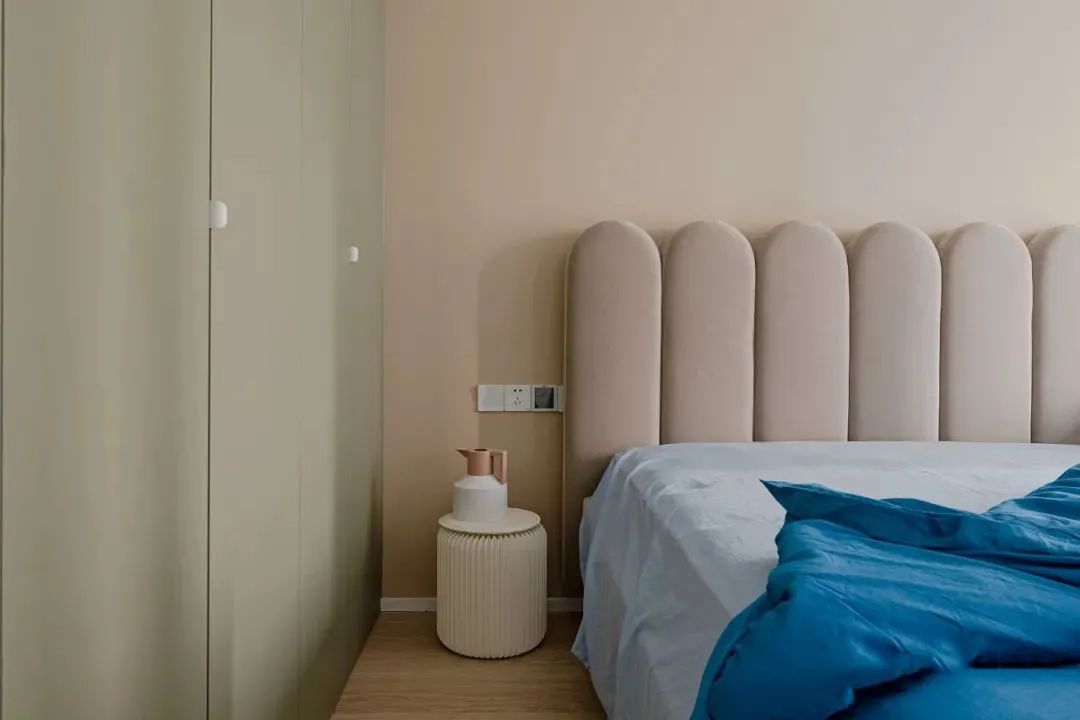 侧边定制豆沙绿整面衣柜,隐形拉手设计增加完整性,手指饼干状的床头设计,搭配一款小圆几,增加空间的设计趣味性。