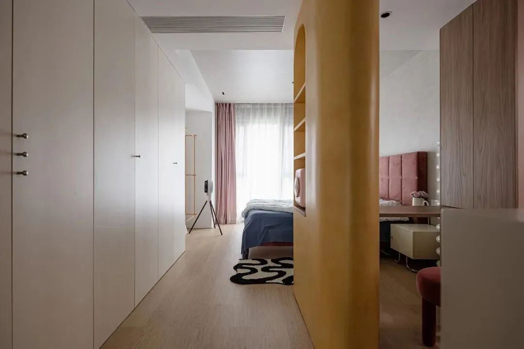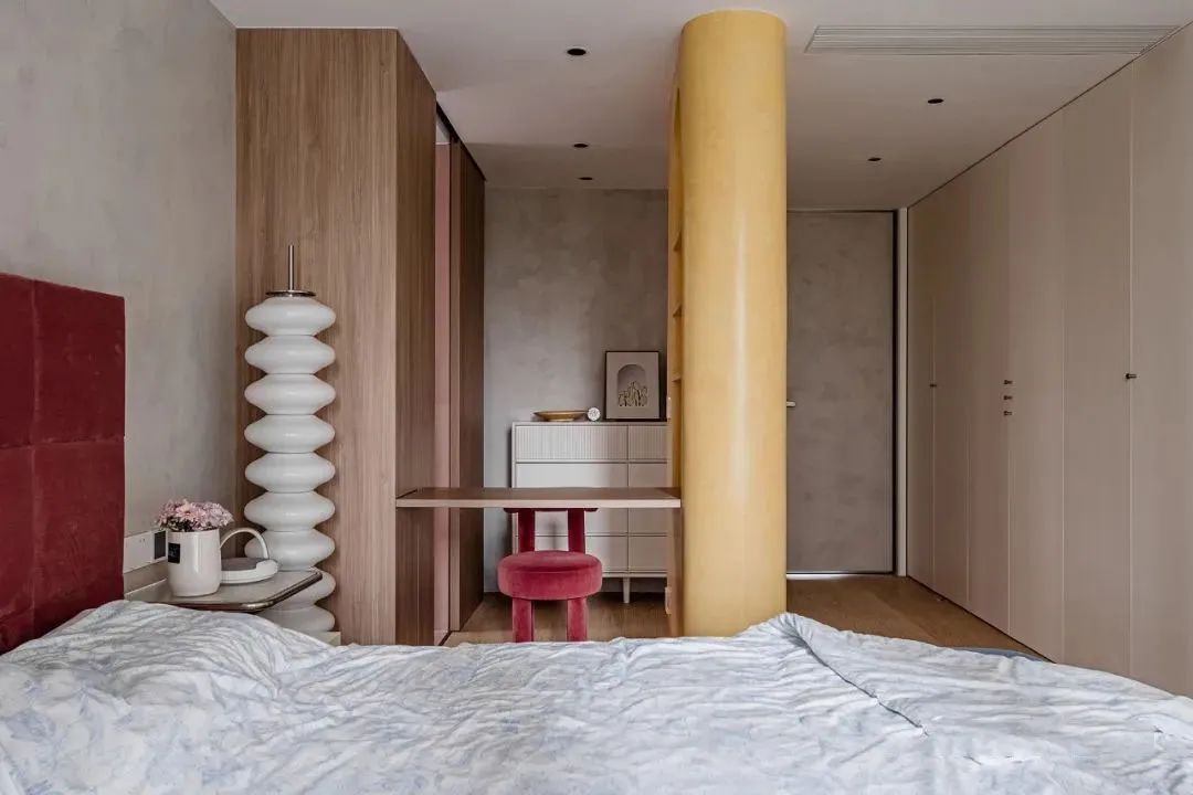 主卧,床尾靠墙打满通顶储物柜,释放超大收纳空间,利用承重柱体规划出梳妆区域,边角充分利用,更大化调动空间实现。