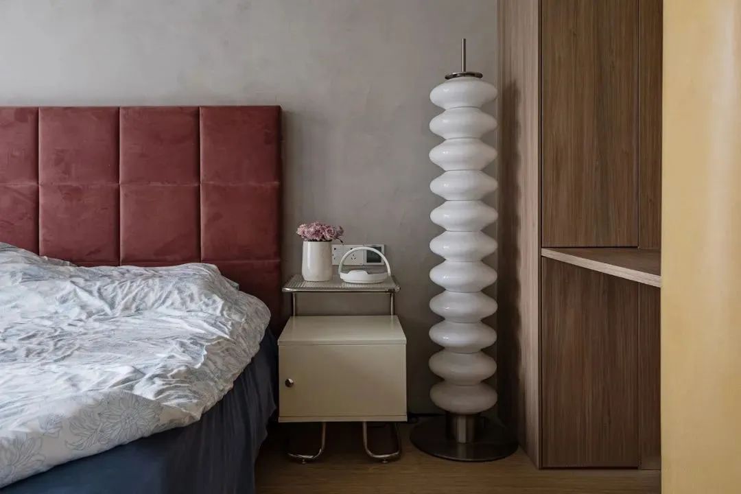 床头一角,粉色丝绒软包设计,搭配铁艺双层床头柜,落地灯饰仿佛一串串的糖葫芦,色彩充满轻甜感,呈现出软糯的温柔质感。