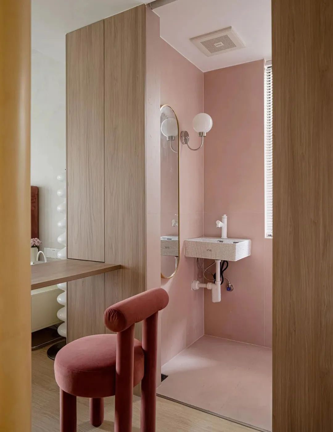 主卫内置隐藏于柜体间,空间通刷嫩粉色艺术漆,定制微型洗手池,金属浴室镜与壁灯装饰点缀,打造精致的洗浴小空间。