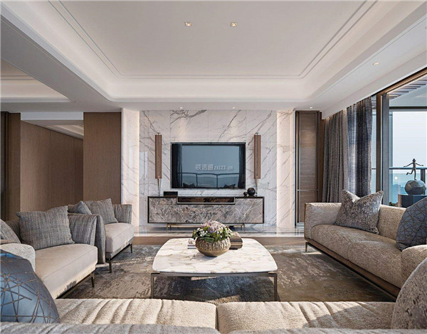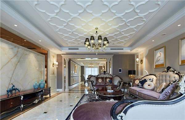 3.欧式风格豪华大平层装修大的特点是在造型上极其讲究,给人的感觉端庄典雅、高贵华丽,具有浓厚的文化气息。在家具选配上,一般采用宽大精美的家具,配以精致的雕刻,整体营造出一种华丽、高贵、温馨的感觉。