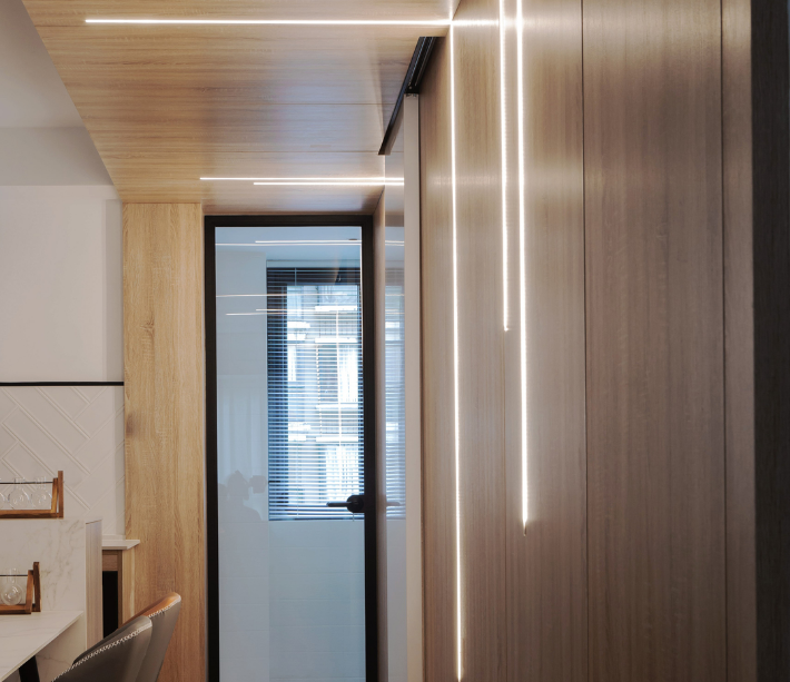 木饰面装饰墙面,同时加入了几何状灯带设计,形成不一样的灯光氛围,作为餐厅背景效果,还是很不错的。玻璃门设计隔断生活阳台,同时保留空间通透效果。
