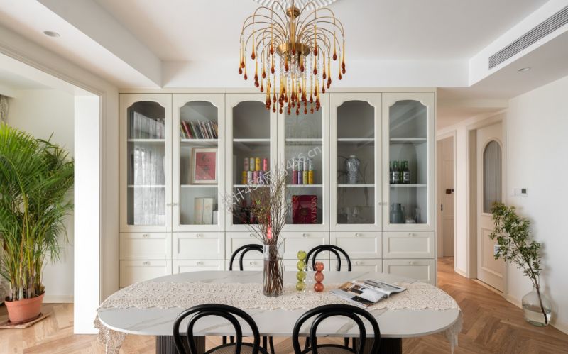 设计理念: 本案屋主是与父母生活在一起三世同堂的五口之家。均从事于设计工作的夫妻俩,对审美有自己独特的见解,希望整体风格富于细节而又不过分繁琐,既有法式的浪漫情调又不失轻松舒适的居住体验。通过详细沟通结合屋主需求,整体以温柔的奶白色为空间主色调,结合法式线条、金属元素及精致软装搭配,呈现出浪漫优雅的法式轻奢居所。 本案屋主是与父母生活在一起三世同堂的五口之家。均从事于设计工作的夫妻俩,对审美有自己独特的见解,希望整体风格富于细节而又不过分繁琐,既有法式的浪漫情调又不失轻松舒适的居住体验。通过详细沟通结合屋主需求,整体以温柔的奶白色为空间主色调,结合法式线条、金属元素及精致软装搭配,呈现出浪漫优雅的法式轻奢居所。