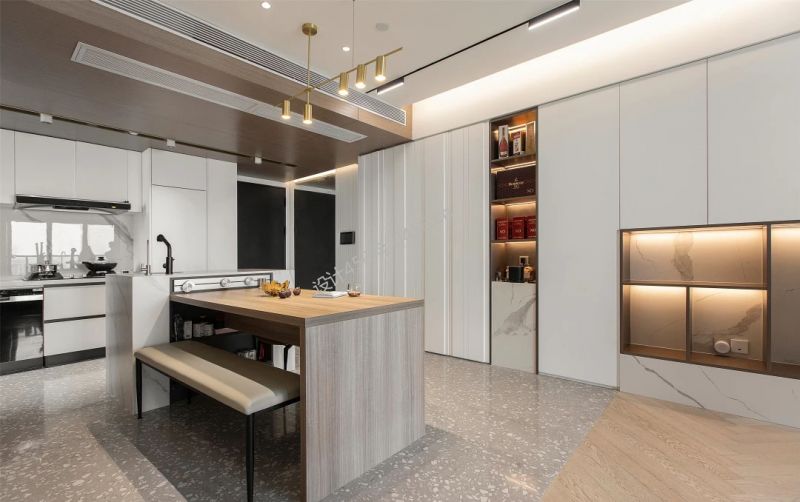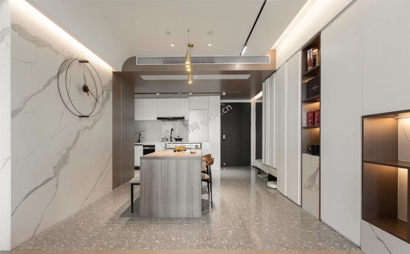 设计理念: 业主是一对青年夫妇,男业主从事金融业,女业主则从业于建筑设计相关的工作。对于家的风格,他们更偏好沉稳中性的大地色调,同时也希望空间保持明亮通透。而房子本身隔墙多,采光和通透性都比较差,又要满足业主的风格需要,于是设计师在材质和灯光设计上下足了功夫!全屋运用了水磨石、金属、岩板和玻璃等多种材质,同时为了缓解这种材质在「家」呈现出过于冷色的生硬感,又以原木色作为空间的主色调,用细腻的灯光设计手法,将色调呈「以柔克刚」的形式层层推进,在完善房子实用功能的基础上也无声地诠释了居住于这个空间的主人的品味。当然,业主希望房子在仍保持沉稳、个性的风格上空间功能也是可持续的,能陪伴他们一同成长和适应,满足更多未来可能的生活场景。比如,孩子的到来和成长间不断变化的空间需求等。 业主是一对青年夫妇,男业主从事金融业,女业主则从业于建筑设计相关的工作。对于家的风格,他们更偏好沉稳中性的大地色调,同时也希望空间保持明亮通透。而房子本身隔墙多,采光和通透性都比较差,又要满足业主的风格需要,于是设计师在材质和灯光设计上下足了功夫!全屋运用了水磨石、金属、岩板和玻璃等多种材质,同时为了缓解这种材质在「家」呈现出过于冷色的生硬感,又以原木色作为空间的主色调,用细腻的灯光设计手法,将色调呈「以柔克刚」的形式层层推进,在完善房子实用功能的基础上也无声地诠释了居住于这个空间的主人的品味。当然,业主希望房子在仍保持沉稳、个性的风格上空间功能也是可持续的,能陪伴他们一同成长和适应,满足更多未来可能的生活场景。比如,孩子的到来和成长间不断变化的空间需求等。
