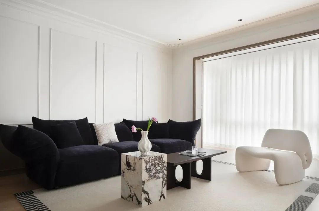 客厅背景墙以黑白琴键的组合样式排列,直线条点缀些许法式小精致,底部镂空设计,融入大理石材质,提供大量的储物空间。